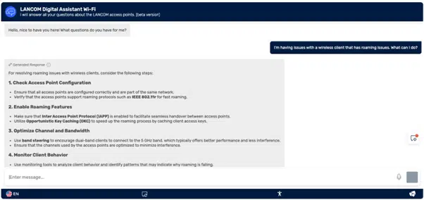 Możesz zadawać pytania dotyczące bezpieczeństwa sieci, bezpieczeństwa IT, zapór LANCOM R&S Unified Firewalls, punktów dostępowych, kontrolerów WLAN, projektowania sieci Wi-Fi, rozwiązywania problemów, a także routerów i bram SD-WAN. Chatbot korzysta z ogromnej bazy wiedzy LANCOM Knowledge Base – zawierającej artykuły wsparcia, przewodniki troubleshootingowe i wiele więcej.